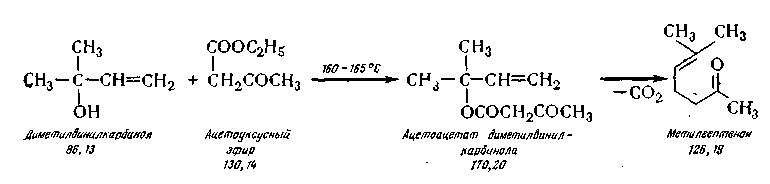 Метилгептенон (6-метилгептен-5-он-2). Получают его конденсацией диметилвинилкарбинола и ацетоуксусного эфира при температуре 160—165° С по следующей химической схеме: