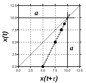 Согласно формуле (2.13) значение x = c0, а согласно (2.17) эта величина лежит на биссектрисе угла между осями декартовых координат (если их масштабы равны) на пересечении с графиком функции (2.16). Так получается один из способов экстраполяционного определения начального содержания реагента. Это особенно важно в тех случаях, когда по каким-то причинам измерить точно эту величину затруднительно. Для этой цели кинетические данные измеряют или представляют через равные интервалы времени. Вся процедура определения x = c0 = a показана ниже на модельном примере.