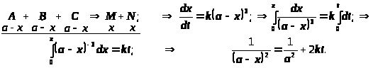 - если начальные концентрации с обоих реагентов равны a, то до самого окончания реакции равными останутся и их текущие концентрации a- x (у продуктов x), и получаем: