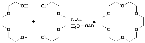 Способность к комплексообразованию проявляется уже при синтезе краун-эфиров. Так при обработке гидроксидом калия смеси триэтиленгликоля и получаемого из него дихлорида (хлорекса) их молекулы координируясь располагаются в пространстве таким образом, что становится возможной циклизация: