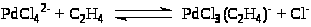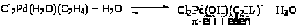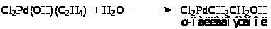 Из уравнения (6) следует, что процесс протекает с лимитирующей стадией и что в стадиях до лимитирующей выделяются ион Н+ и два иона Cl– при взаимодействии PdCl>4>2– и C>2>H>4>. Для выяснения вопроса о том, из какой частицы выделяется Н+, провели опыты с меченым этиленом (C>2>D>4>) в H>2>O. Оказалось, что ацетальдегид содержит 4 атома D (CD>3>CDO) и, таким образом, Н+ может выделяться только из молекулы H>2>O. Схема механизма, соответствующая уравнению (6) и подтвержденная независимым исследованием равновесий в этой системе, включает стадии