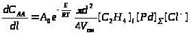 Для расчетов промышленного реактора в случае системы PdCl>2>-CuCl>2> в условиях постоянной концентрации HCl по длине трубчатого реактора (труба в трубе) используют несколько измененное уравнение, найденное экспериментально на основе уравнения (6). Скорость накопления ацетальдегида (САА) или исчезновения этилена вдоль трубы длиной l описывают уравнением