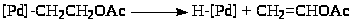 Процесс синтеза винилацетата по реакции (15) протекает в рамках механизма, аналогичного "Вакер"-процессу. Предполагается превращение -комплекса Pd(II) в -палладийорганическое соединение под действием OAc– из раствора, а распад полученного интермедиата включает стадию -элиминирования ~PdH