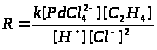 Кинетическое уравнение для реакции (2) в присутствии п-бензохинона (Q) было получено в закрытой системе без газовой фазы (И.И.Моисеев и др.) и по поглощению этилена в двухфазном реакторе полного смешения волюмометрическим методом (П.Генри). В области концентраций PdCl>2> до 0.02 М при постоянной ионной силе (I = 1 – 3) в системе NaCl – LiClO>4> – HCl – HClO>4> = Const Pd(II) находится преимущественно в форме PdCl>4>2– , и закомплексованность Pd(II) этиленом не существенна. Скорость реакции (2) или реакции (5)