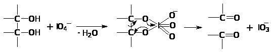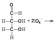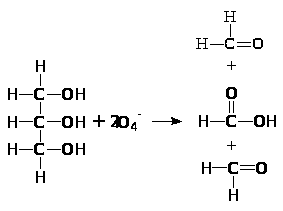 Следует заметить, что при этом окислении вместо разорванной СС-связи у каждого из атомов углерода появляется связь СО. Если в молекуле рядом с гидроксильной группой имеется две другие гидроксильные группы, то образуется муравьиная кислота. По составу и соотношению образующихся продуктов окисления можно судить о строении исследуемого вещества. Напиример, периодатное окисление глицерина приводит к образованию двух мольэквивалентов формальдегида и одного муравьиной кислоты.