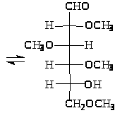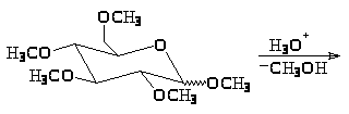 Процесс называется исчерпывающим алкилированием. Метоксигруппы при С-2, С-3, С-4 и С-6 пентаметилглюкопиранозида являются обычными эфирными группами. Эти группы устойчивы в слабокислых водных растворах. В то же время метоксигруппа при С-1 отличается от других тем, что она является ацетальной (гликозидной). Поэтому при гидролизе в слабокислом растворе отщеплению подвергается лишь гликозидная группа: