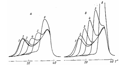 Каждая кривая получена следующим образом: образец после кристаллизации при 0° в течение 60 мин нагревали со скоростью 10 град/мин (рис. 1, а) и 0,62 град/мин (рис. 1, б) до некоторой температуры в области пика плавления, затем резко охлаждали и вторично нагревали со скоростью 20 град/мин до окончания плавления. Пик плавления, получаемый при последнем нагревании, записан на термограмме. При сопоставлении его с предыдущим пиком, полученным при нагревании до более низкой температуры, видно, что начальная часть пика исчезает из-за плавления некоторой части кристаллической фазы при предварительном более медленном нагревании. Далее, однако, пик плавления превышает предыдущий. Эта избыточная площадь соответствует рекристаллизовавшейся массе при первом нагревании.