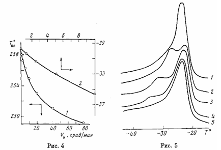 Таким образом, наличие одинарного пика не является показателем отсутствия рекристаллизации. Оно может быть обусловлено тем, что скорость кристаллизации при данных к, m и Vн не может стать больше скорости нагревания. На рис. 4, 5 и в таблице приведены результаты экспериментальной проверки некоторых закономерностей, вытекающих из полученных соотношений, а именно на рис. 4 проиллюстрирован эффект снижения начала температуры плавления с ростом скорости нагревания, а на рис. 5 показано изменение формы термограмм в области пика плавления в зависимости от температуры кристаллизации.