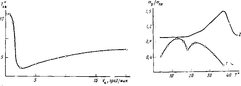Из изложенного выше вытекает, что при нагревании полимера должны получиться термограммы двоякого типа. Если скорость кристаллизации полимера достаточно велика, так что V>p> сопоставима или больше скорости повышения температуры, то между температурой кристаллизации и пиком плавления на термограмме появится температурный интервал — предпиковая область. Она будет тем больше, чем выше скорость рекристаллизации. В случае медленно кристаллизующихся полимеров, когда V>P><V>н>, предпиковой области не будет. Своеобразную картину изменения температуры плавления в зависимости от изменения скорости повышения температуры можно получить, если скорость рекристаллизации полимера находится в диапазоне скоростей нагревания, используемых в термическом анализе. Такой случай приведен на рис. 2. При V>H>=0,31, 0,62 и 1,25 град/мин V>p> полихлоропрена оказывается выше скорости повышения температуры, и на термограмме появляется предпиковый интервал. При V>H> =2,5 град/мин, наоборот, оказывается V>р><V>н> и плавление начинается сразу после кристаллизации. Небольшой подъем T>пл>н при увеличении скорости нагревания обусловлен перегревом образца. Исследование при V>H>=0,62 град/мин дает картину (рис. 1,6), свидетельствующую о том, что рекристаллизация начинается сразу после кристаллизации, как и при скоростях нагревания, когда предпиковая область не появляется (рис. 1, а).