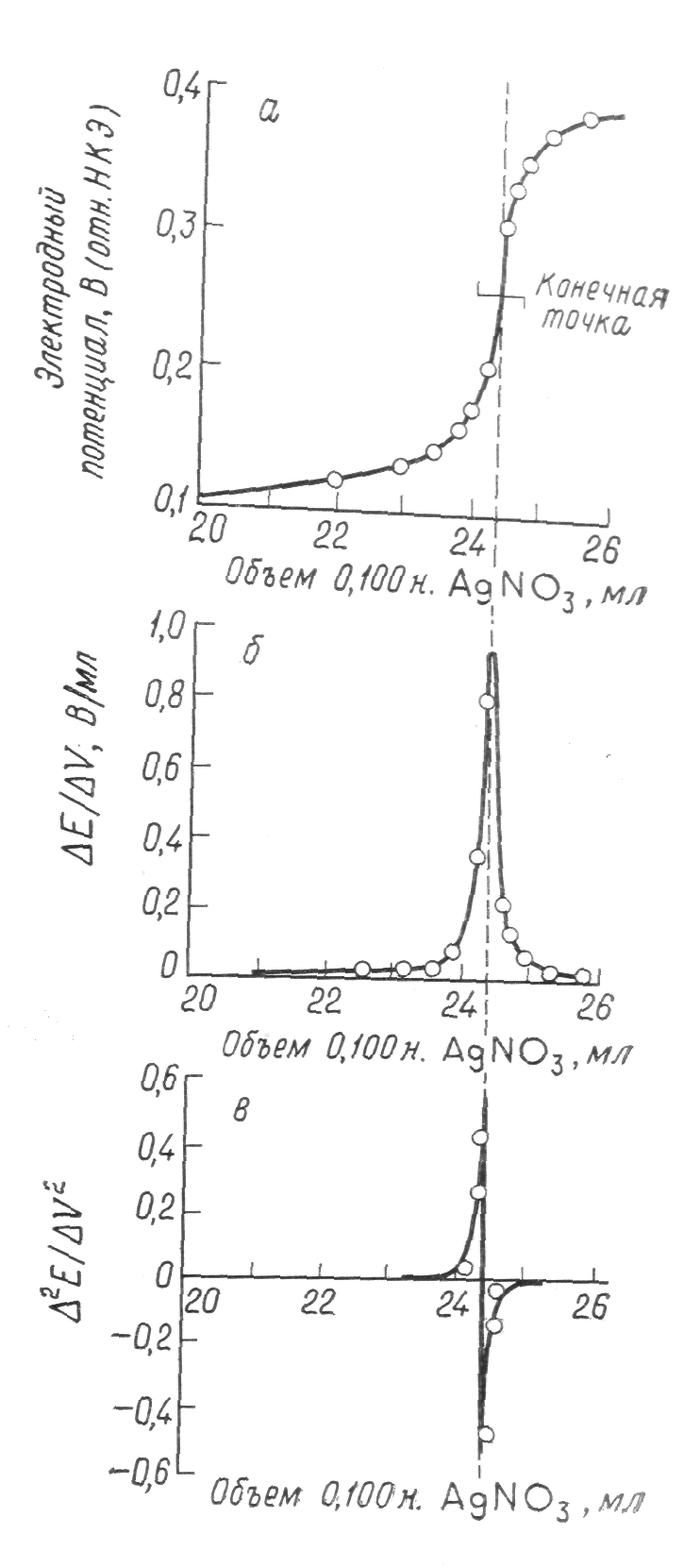 Для определения конечной точки потенциометрического титрования можно использовать различные способы. Наиболее простой состоит в построении графика зависимости потенциала или рН от объема реагента (рис. 2.1. а). Затем визуально определяют среднюю точку участка, соответствующего вертикальному подъему кривой, и принимают ее за конечную точку. Предложены различные механические способы установления средней точки, но они ненамного улучшают точность ее нахождения.