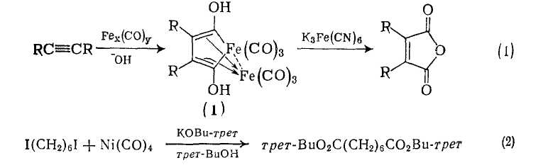 Этому важному методу получения дикарбоновых кислот посвящен обзор [1]. Типичный пример — синтез малеиновых ангидридов при реакции ацетилена с карбонилом железа в водной щелочи {схема (1)}. Продукт реакции (1) при окислении феррицианидом калия или азотной кислотой дает малеиновый ангидрид. Алкоксикарбонилирование органических галогенидов (RHal) карбонилом никеля и алкоксидом щелочного металла разработано Кори [2] и другими авторами, и применяется для синтеза сложных эфиров дикарбоновых кислот {схема (2)}.