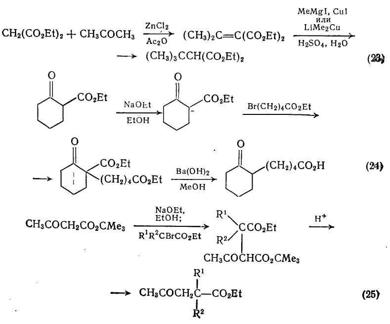 Для синтеза замещенных малоновых эфиров можно использовать прямое алкилирование диэтилнатриймалоната, однако метод не совсем удачен, так как часто приводит к побочным продуктам, получающимся за счет дегидрогалогенирования алкилгалогенидов. Реакции элиминирования можно до некоторой степени избежать при использовании сопряженного присоединения реактива Гриньяра к алкилиденмалонату, как, например, в синтезе трет-бутилмалоната присоединением метилмагнийиодида к изопропилиденмалонату {схема (23)}. Сопряженное присоединение реактивов Гриньяра к α,β-ненасыщенным сложным эфирам служит основной реакцией; ее можно значительно ускорить в присутствии 1% (мол.) хлорида меди (1). В частности, такие медьорганические реагенты, как LiMeCu и МеСuР(С>4>Н>9>-н), селективно присоединяются к β-углеродному атому α,β -ненасыщенных кетонов, обеспечивая потенциальное расширение метода по реакциям, аналогичным приведенным на схеме (23).