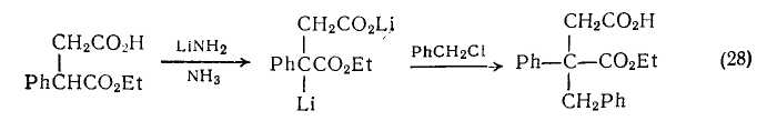 Алкильные производные янтарной кислоты можно получать алкилированием дианиона, в свою очередь полученного из моноэтилсукцината; алкилирование протекает региоспецифично {схема (28)} по соседнему со сложноэфирной группой углеродному атому. Другие а-алкильные производные адипиновой и пимелиновой кислот можно получать более сложной последовательностью реакций {схема (29)}, так как в этом случае анионы легко вступают в циклизацию по Дикману.