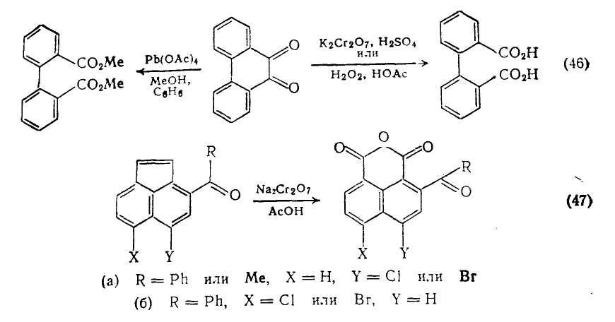Окисление фенантрахшюна {схема (46)} служит удобным методом синтеза как бифенил-2,2'-дикарбоновой кислоты так и ее диметилового эфира. Окисление различных ацилгалогенаценафтенов приводит к соответствующим нафталиновым аи гидридам, хотя существуют заметные различия в легкости образования ангидридов {схема (47)}.