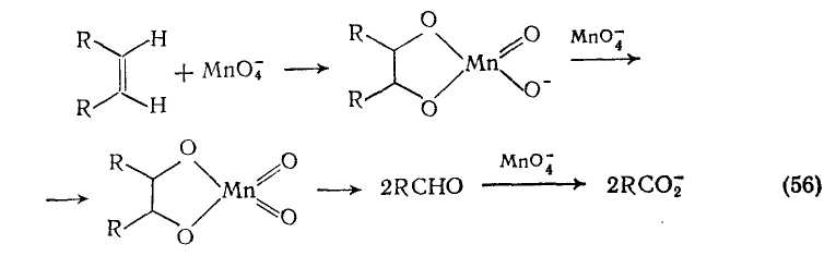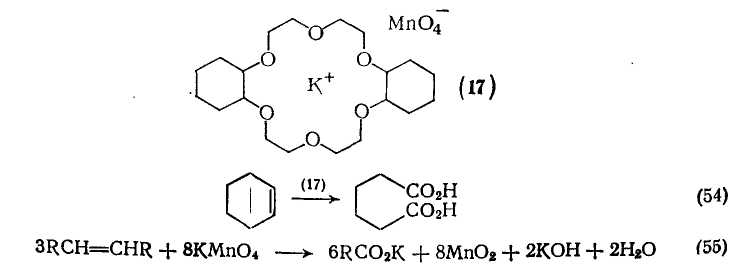 Использование краун-эфиров позволяет снять большинство проблем [50], ибо эти соединения способны образовывать комплексы с солями металлов, что приводит к повышению растворимости в органической среде и повышению реакционной способности анионов. Например, дпцн;слогексил-18-краун-6 образует с перманганатом калия растворимый в бензоле комплекс (17), что дает прекрасный окислитель для органических субстратов. В частности, циклогексен окисляется им с количественным выходом до адипиновой кислоты {схема (54)}. По-видимому, нет оснований предполагать, что механизм этого окисления отличается до такового, действующего в водных средах {схемы (55), (56)}.
