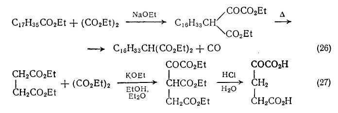Для получения производных сложных эфиров малоновой кислоты можно использовать диэтилоксала, проводя сложноэфирную конденсацию Кляйзена и последующее термическое декарбонилирование {схема (26)}. Это достаточно общий метод введения этоксикарбонильной группы. Применение сложных эфиров, таких, как диэтилсукцинат {схема (27)}, может приводить к получению α-оксопронзводных дикарбоновых кислот путем гидролиза промежуточного сложного эфира β-оксополикарбоновой кислоты.