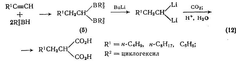 Аналогично, можно проводить превращение ацетиленов в малоновые кислоты с использованием гем-борорганических соединений [10] типа (5) {схема (12)}; при использовании 2 моль бутил-лития можно достичь выхода 65—70%. Другой хороший метод [11] синтеза производных замещенной малоновой кислоты реакция α-анионов сложных эфиров с диоксидом углерода. Анионы генерируют с помощью диизопропиламидалития в тетрагидрофуране,