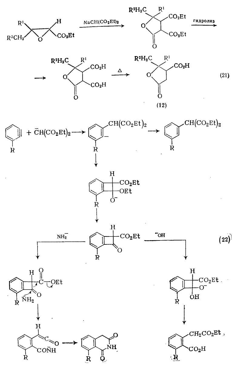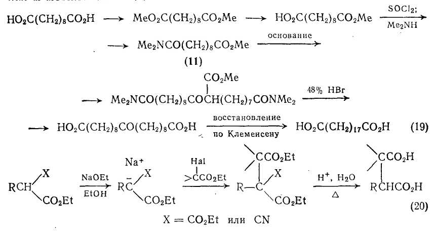 Алкилирование анионов, получаемых из эфиров малоновой кислоты или этилцианоацетата, широко используется для синтеза монокарбоновых кислот, и как видно из схемы (20), может также применяться для получения дикарбоновых кислот. При использовании в качестве алкилирующих агентов соответствующих сложных эфиров галогенокислот {схема (20)} этот метод в принципе может позволить получать различные ди- и поликарбоновые кислоты.