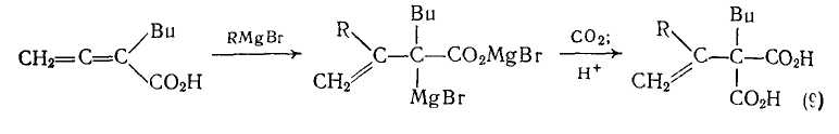 При обработке реактивами Гриньяра некоторые алленкарбоновые кислоты можно превратить в металлорганические соединения. Последующее взаимодействие этих соединений с диоксидом углерода {схема (9)} приводит с хорошим выходом к (1-алкилвинил) малоновым кислотам [8].