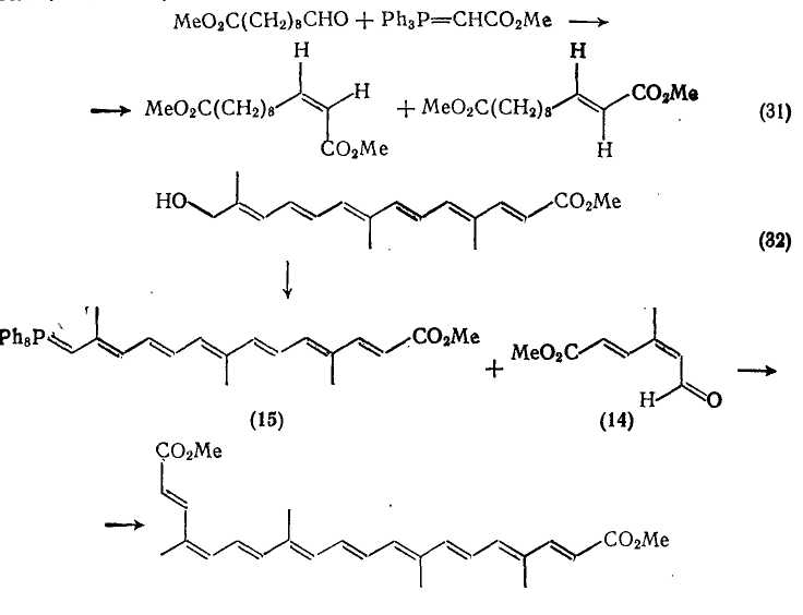 Реакция Виттига — важнейший общий метод региоспецифичного синтеза сложных эфиров α,β -ненасыщенных и полиеновых дикарбоновых кислот. В типичном синтезе {схема (31)} [36], как и во многих подобных случаях, продукт реакции является смесью цис- и транс-изомеров, которые в данном конкретном случае можно разделить дробной кристаллизацией. Особенно широко реакция Виттига применяется в синтезе каротиноидов; в некоторых случаях в этих синтезах используются производные ненасыщенных дикарбоновых кислот. В качестве типичного примера приведем синтез природного биксина {схема (32)}: ключевой интермедиат 5-метоксикарбонил-3-метилпента-цис-2-гранс-4-диеналь (14), как показано на схеме, конденсируется с илидом (15) в стандартных условиях реакции Виттига.