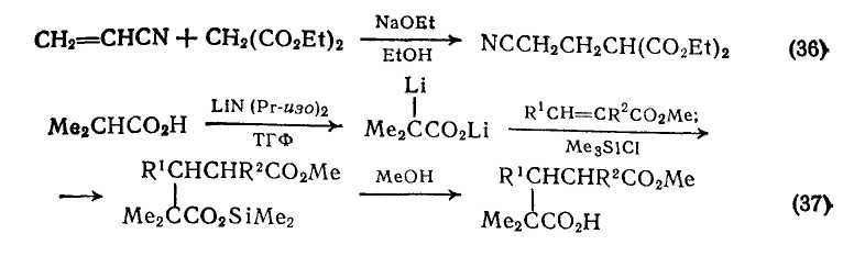 Глутаровые кислоты можно также получить присоединением дианионов карбоновых кислот к α,β-ненасыщенным сложным эфирам {схема (37)}. Дианион изомасляной кислоты получают в тетрагидрофуране при 0°С с использованием двух эквивалентов основания; вслед за присоединением по Михаэлю следует триметилсилилирование продукта.