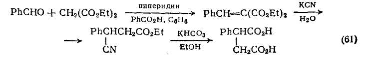 Важным методом синтеза карбоновых кислот является гидролиз нитрилов. В обзоре [56], посвященном малононитрилу, обсуждается его алкоголиз до диэтилмалоната. Синтез янтарной кислоты гидролизом нитрила показан на примере получения [57]; фенилянтарной кислоты {схема (61)}. В этом синтезе использованы конденсация Кневенагеля и последующее присоединение к продукту реакции цианида калия по Михаэлю.