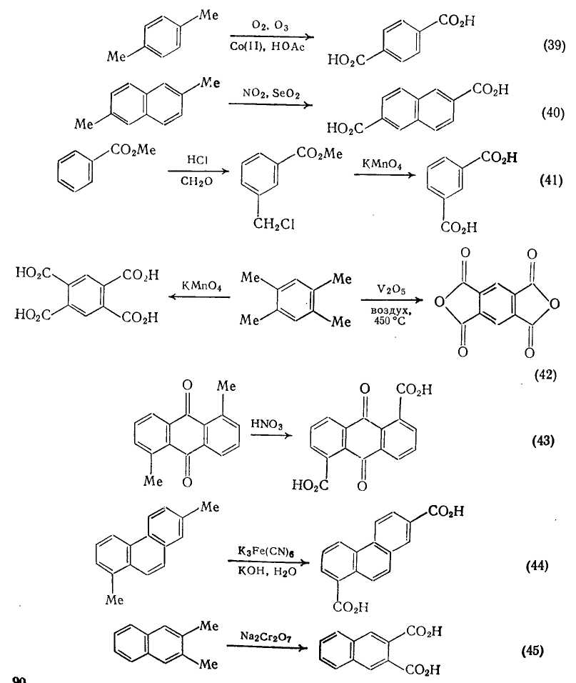 Для получения ароматических ди- и поликарбоновых кислот широко используют окисление боковых цепей различных ароматических соединений. Алкилбензолы, такие как изомерные ксилолы, легко окисляются в соответствующие карбоновые кислоты в жестких условиях. Примеры на схемах (39) —(45) иллюстрируют набор окислительных агентов, которые можно использовать для этой цели.