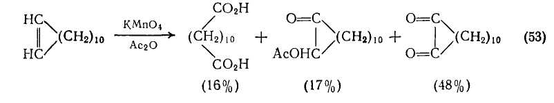 Олефины можно окислять до дикарбоновых кислот {схема (52)} различными способами, и если бы не возникали проблемы, связанные с растворимостью в органических растворителях, наиболее удобным для этой цели был бы перманганат калия. Эти затруднения до некоторой степени преодолимы [49], если использовать в качестве растворителя уксусный ангидрид. Однако в этом случае выходы снижаются, и как показано на примере окисления по схеме (53), могут протекать побочные реакции.