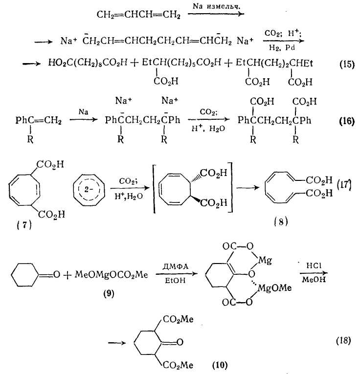 Используя путь, показанный на схеме (15), из бутадиена можно получить набор дикарбоновых кислот. При действии натрия в строго определенных условиях бутадиен димеризуется с образованием динатрийоктадиена. Получающийся делокализованный дианион реагирует с диоксидом углерода, давая смесь трех возможных региоизомерных диеновых дикарбоновых кислот, гидрирование которых приводит к себациновой, 2-этилпробковой и 2,5-диэтиладипиновой кислотам в соотношении 3,5: 5 : 1 соответственно. Эта важная реакция, распространенная на такие ароматические соединения, как стирол и 2-метилстирол, приводит к производным адипиновой кислоты {схема (16)}, причем оба продукта можно гидрировать до соответствующих дициклогексильных производных.
