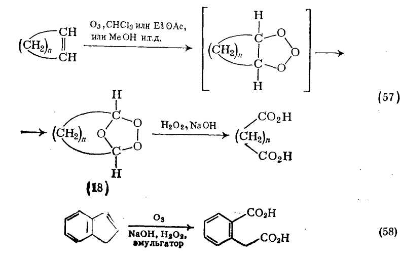 Озонолнз олефинов, как правило, проводят в органических растворителях, часто при низких температурах. Образующийся озонид (18), который обычно слишком нестабилен для безопасного выделения, можно окислять до карбоновых кислот. При окислении циклического олефина продуктом реакции служит дикарбоновая кислота {схема (57)}. Этот двухстадийный процесс можно упростить [52], так как было показано, что в благоприятных случаях эмульсии циклических олефинов и щелочного пероксида водорода мягко реагируют с озоном и с хорошими выходами образуют а,со-дикарбоновые кислоты {схема (58)}.