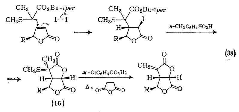 Полный синтез фунгицида (±)-авенациолида включал в качестве ключевой стадии получение замещенного бислактона (16) в результате сходного с реакцией Михаэля процесса {схема (38)}. На последних стадиях этого синтеза нужная двойная связь вводилась пиролизом сульфоксида в присутствии янтарного ангидрида.