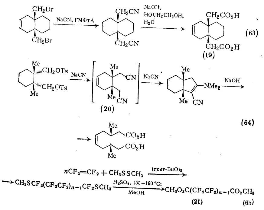 Заслуживает внимания другая методика, включающая гидр>0>. лиз так как она является общим методом получения перфторал-кандикарбоновых кислот из а,со-бис(метилтио)полифторалканов [60]. Теломеризация тетрафторэтилена в присутствии диметилди-сульфида и грег-бутилпероксида в качестве катализатора приводит к продуктам типа (21) {схема (65)}. Как видно из схемы, эти продукты (п = 2—5) гидролизуются серной кислотой в метаноле до метиловых эфиров фторированных дикарбоновых кислот.