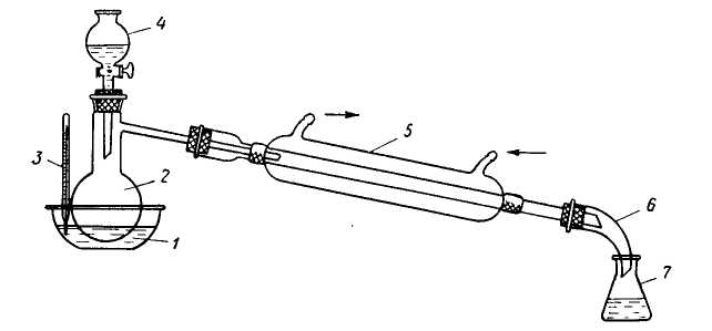 1 — баня; 2 — реакционная колба; 3 — термометр; 4 — капельная воронка; 5—холодильник; 6 — алонж; 7 — приемник.