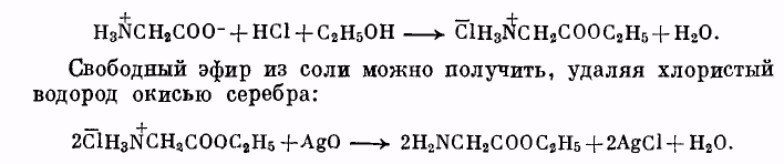 В результате этерификации в этих условиях эфиры также получаются в виде солей. Например, из аминоуксусной кислоты (гликоколя) и абсолютного этилового спирта образуется хлористоводородная соль эфира гликоколя
