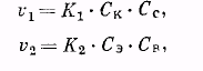 где v>1> — скорость реакции этерификации; v>2> — скорость реакции гидролиза; К>1> и К>2> — константы скорости обеих реакций; С>к>, С>с>, С>э> и С>в> — концентрации реагирующих и получающихся веществ (кислоты, спирта, эфира, воды).