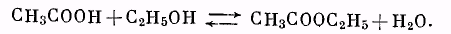Из полученного уравнения следует, что в состоянии равновесия отношение произведений концентраций реагирующих веществ обратно отношению констант скоростей реакций. В случае реакции образования уксусноэтилового эфира в состоянии равновесия, как упомянуто выше, в реакционной смеси содержится по 1/3 моля кислоты и спирта и по 2/3 моля эфира и воды. Поэтому