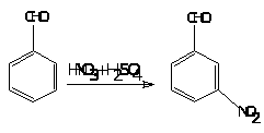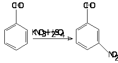 В трехгорлой колбе, снабженной механической мешалкой и капельной воронкой, растворяем при комнатной температуре 5,5 г (0,054 моль) нитрата калия и 20 мл концентрированной серной кислоты. Колбу помещаем в баню со смесью льда с солью и, при Т=0°С и сильном перемешивании, из капельной воронки медленно приливаем 5 мл (0,048 моль) бензальдегида, поддерживая температуру 0-5°С. По окончании приливания бензальдегида перемешивание продолжаем еще 1,5 часа, и затем густую, окрашенную в оранжевый цвет реакционную массу выливаем в стакан емкостью 100 мл, содержащий измельченный лед. Выделившийся осадок промываем на воронке Бюхнера водой и 10 мл 5%-ного раствора соды и еще несколько раз холодной водой, тщательно отжимаем и сушим. Выход чистого продукта 5,6г (78 % от теоретич.), т.пл.=58-59°С (литер. т. пл. 58-60°С).