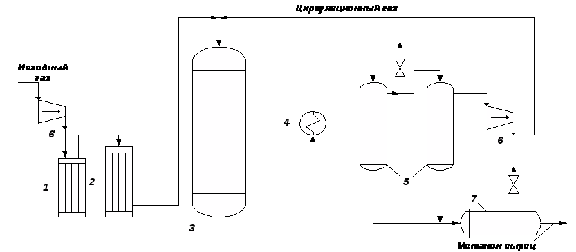 5. Технологический процесс получения метанола из оксида углерода и водорода включает ряд операций, обязательных для любой технологической схемы синтеза. Газ предварительно очищается от карбонила железа, сернистых соединений, подогревается до температуры начала реакции и поступает в реактор синтеза метанола. По выходе из зоны катализа из газов выделяется образовавшийся метанол, что достигается охлаждением смеси, которая затем сжимается до давления синтеза и возвращается в процесс.