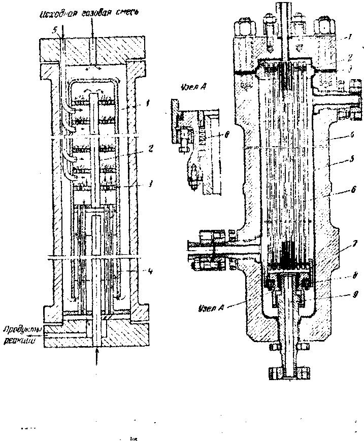 Технологические схемы различаются аппаратурным оформлением главным образом стадии синтеза, включающей основной аппарат колонну синтеза и теплообменник. На рис. 1 представлена схема агрегата синтеза высокого давления с так называемой совмещенной насадкой колонны.