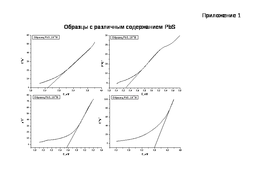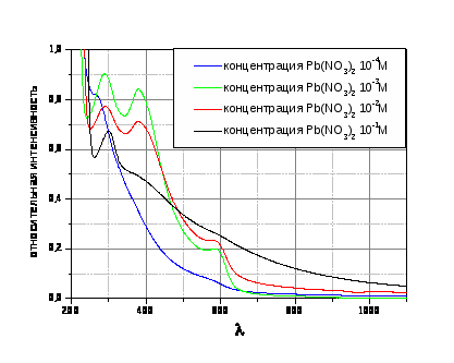 Для получения нанокристаллических частиц PbS в растворе поливинилового спирта на первом этапе работы были проведены исследования по выбору оптимальной концентрации спирта. Было решено приготовить четыре раствора спирта с концентрациями 1%, 10-1%, 10-2%, 10-3% и с концентрацией Pb(NO>3>)>2> 10-2M в каждом. При обработке данных спектрометра оказалось, что оптимальным из представленных растворов является 1% раствор ПВС. На следующем этапе работы было решено провести исследование влияния концентрации свинца на величину получаемых нанокристаллических частиц и соответственно энергий запрещенных зон. Было приготовлено четыре раствора нитрата свинца: 0,1М, 0,01М, 0,001М и 0,0001 в 1% растворе спирта. Далее, к полученным растворам добавляли свежеполученную серную воду. С полученных растворов были сняты спектры поглощения.