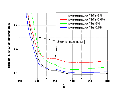 Стехимиометрическую смесь исходных реактивов тщательно перетирали на воздухе в агатовой ступке, после чего отжигали при 1100оС в течение 12 часов. Свежеосажденные и высушенные сульфиды перетирались с порошком стекол. Было приготовлено четыре смеси: с содержанием PbS/PbTe 6%, 0,6% массовых процента. Полученные массы наносились на пластинки и отжигались при 12000С в течение 2 часов. С полученных стекол были сняты спектры поглощения.