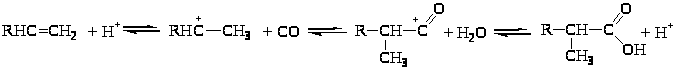 Механизм реакции состоит в предварительном протонировании алкена кислотой с образованием иона карбения, его взаимодействия с СО с получением ацилий – катиона и реакции последнего с водой с образованием карбоновой кислоты: