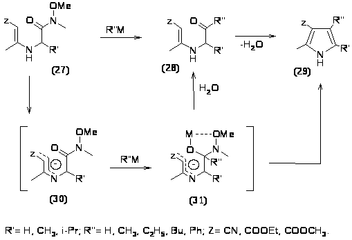 Ключевой стадией процесса является превращение N метокси N метил енамино-карбоамидов (27) в карбонильные производные (28) под действием металлорганических соединений. На этой стадии металлорганическое соединение (МеLi, MeMgI) селективно атакует амидную группу. При этом сначала под действием металорганического соединения отщепляется протон, давая сопряженный анион (30) к которому присоединяется металлорганическое соединение, давая интермедиат (31) при гидролизе которого образуется карбонильное соединение (28), причем здесь же может происходить частичная или полная циклизация до пиррола (29). Дальнейшая циклизация карбонильного соединения (28) до пиррола (29) происходит в условиях щелочного катализа (NaOC2H5/ C2H5OH), выходы пирролов составляют 60-70% в зависимости от заместителей [37, 38].