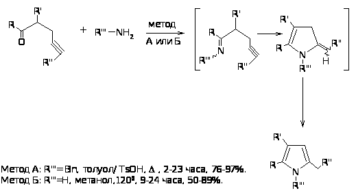 Синтез замещенных пирролов может быть также осуществлен с хорошим выходом реакцией γ-кетоалкинов с бензиламином или аммиаком. Механизм реакции, вероятно, включает образование имина, который подвергается 5-экзодициклизации с последующей изомеризацией давая пиррол [35].