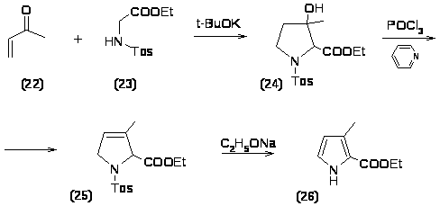 Присоединение по Михаэлю эфира N-тозилглицина (23) к кетону (22) в присутствии третбутилата калия с последующей внутримолекулярной альдольной конденсацией приводит к образованию гидроксипирролидина (24), при дегидрогалогенировании которого образуется Δ3-пирролин (25); отщепление от него п-толуолсульфиновой кислоты под действием этилата натрия приводит к пирролу (26) с удовлетворительным выходом ~ 30-40% [16].