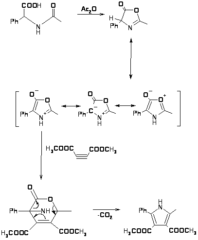 Ещё одним способом получения пирролов является получение пирролов по Хьюгенсу с помощью 1,3-диполярного присоединения диэфиров ацетилендикарбоновых кислот к азолактонам, образующимся в результате циклизации N-замещенных фенилглицинов в присутствии уксусного ангидрида [16]. В результате таутомерии азолактон находится в равновесии с ароматическим азометинилидом, к которому присоединяется диэфир ацетилендикарбоновой кислоты с образованием бициклического интермедиата, при отщеплении от которого CO2 образуется тетразамещенный пиррол с выходом 70-80% [34].