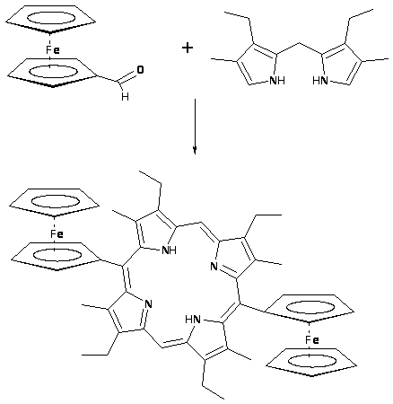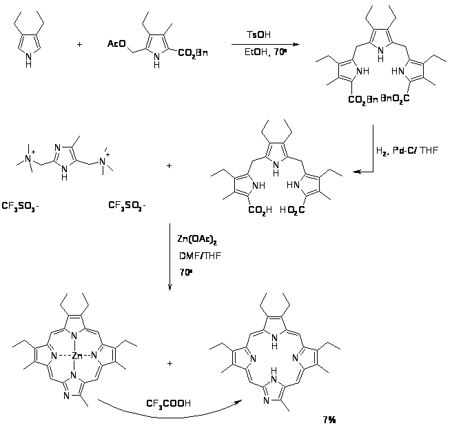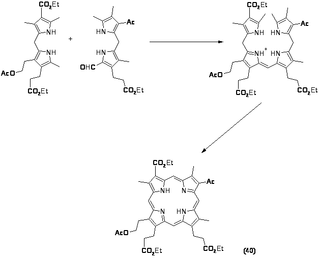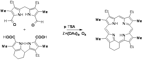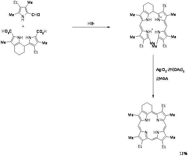 Первоначальный метод Макдональда включал использование одного дипиррометана, содержащего две формильные группы в α положениях и другого α свободного или содержащего карбоксильные группы дипиррометана [33,54,55].