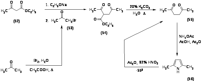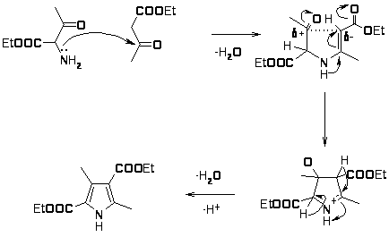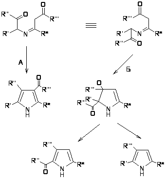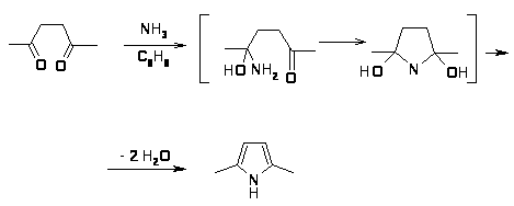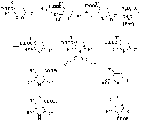 Синтез пирролов по Кнорру удобнее проводить без выделения промежуточного аминокетона [14]. Исследование этой реакции показало, что основным ограничением при использовании этой реакции является склонность -аминокетонов к димеризации [15].