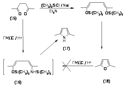 Метод получения 2,5-диметилпиррола (17) из 2,5-гександиона (15) и гексаметилдисилазана (ГМДС) в присутствии трифторметансульфокислоты является отличным по выходу-100%, но дорогим из-за использования трифторметансульфокислоты. Реакция протекает через промежуточное соединение (16). Попытки получить 2,5-диметилпиррол (17) из 2,5 диметилфурана (18) через это соединение закончились неудачно [29].
