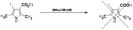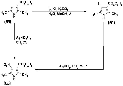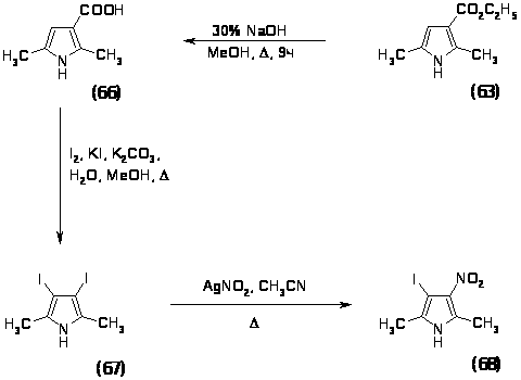 Разработаны методы синтеза 5 новых соединений: диэтил 2-(пиррол-2-илметилен)малоноат (59), диэтил 2 [(5 формилпиррол-2-ил)метилен]малоноат (60), 2,5-диметил-3-йод-4-карбоэтоксипиррол (64), 2,5-диметил-3-карбоэтокси-4-нитропиррол (65), 2,5-диметил-3,4-дийодпиррол (67).